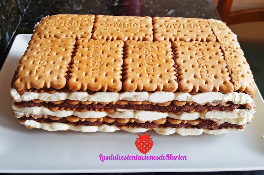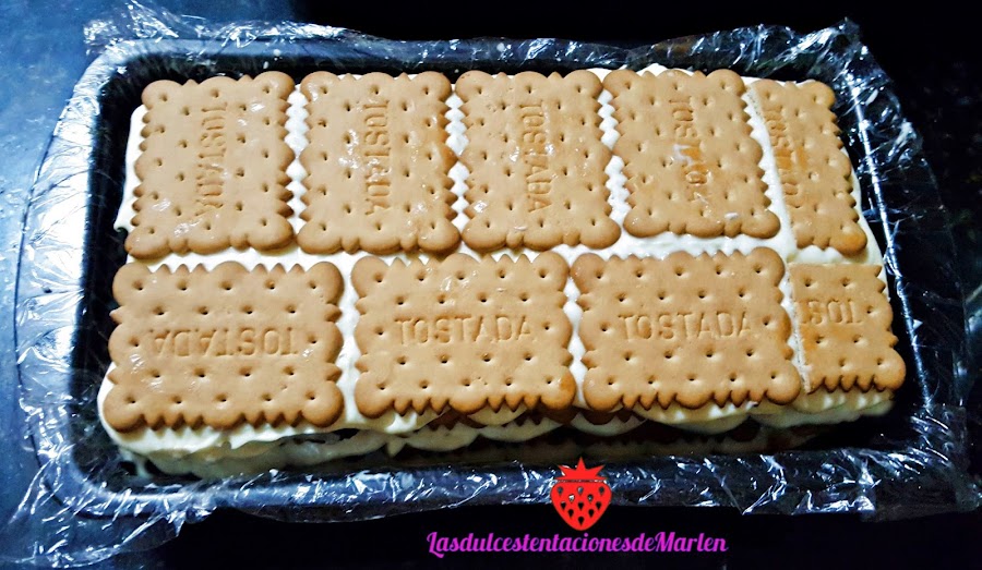 Encima del todo, lo que al desmoldar será la base, pondremos una capa de galletas pero esta vez sin mojar en leche para sea un poco más consistente. Cubriremos con papel film y dejaremos reposar en el frigo al menos unas 4-5 horas. (a mi me gusta dejarla de un día para otro).
