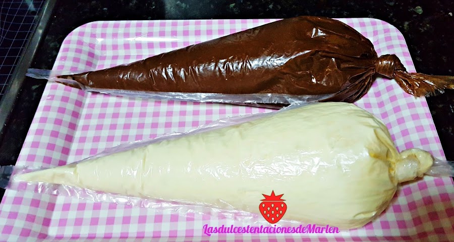 Una vez tengamos las dos cremas frías las batiremos por separado, con la ayuda de una varillas eléctricas hasta que monten un poco. Debe quedar con textura como la de una crema de chocolate para untar. (cuidado porque si batimos demasiado podemos cortar la mezcla.Una vez tengamos las dos cremas listas comenzaremos ya con el montaje de la tarta. ( yo he puesto cada crema en una manga pastelera de estas de usar y tirar, se puede utilizar también unas bolsas de plastico que tengamos, esto es opcional)