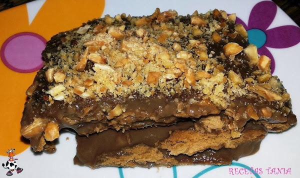 En una fuente o molde para tartas vamos poniendo una base de galletas y añadimos la natilla de chocolate,troceamos unas almendras y las ponemos encima de la natilla de chocolate, ponemos otra capa de galletas y otra vez natilla de chocolate y trocitos de almendras y así hasta acabar con las galletas y con las natillas.Cuando se enfríe la metemos en la nevera mínimo 3 horas y luego decoramos con almendras picaditas. Está riquísima!! :D