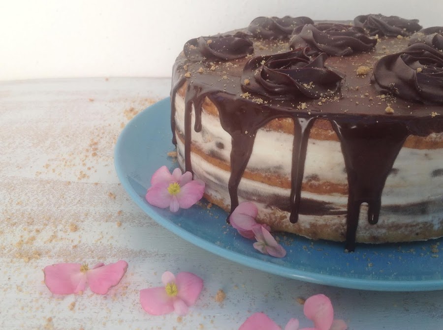 Derretimos en el microondas dos o tres cucharadas de ganache y lo esparcimos por la superficie de la tarta. Por último decoramos haciendo rosas de ganache con una manga pastelera con boquilla 1M y espolvoreamos con miga de galletas.