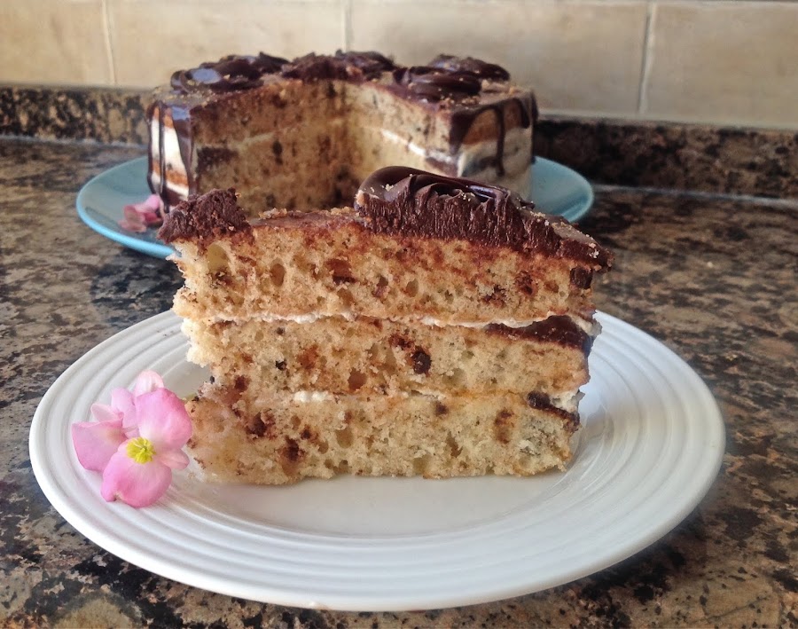 Ponemos en un plato un poco de nata montada (crema de leche) y colocamos encima un bizcocho (bizcochuelo). Hacemos un círculo de ganache en el borde del bizcocho y rellenamos con nata montada (crema de leche), cubriendo bien. Colocamos encima otro bizcocho y repetimos la operación cubriendo por último, con el último bizcocho. Cubrimos con nata montada (crema de leche) y dejamos refrigerar durante 15 minutos.