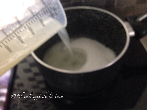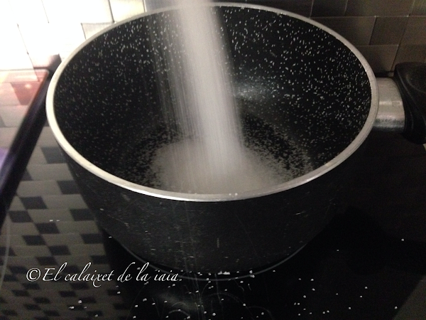 Mientras tanto pondremos los 100g de azúcar en una cazo a calentar, a fuego lento (si os cae el azúcar fuera como a mí y tenéis vitrocerámica,limpiadlo de inmediato, ya que tanto el azúcar como la sal, rayan irremediablemente el cristal de la vitro)
