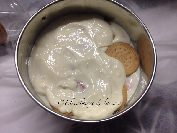 colocamos en la base de nuestro molde desmoldable una hoja de papel sulfurizado o de horno, partida por la mitad, una mitad sobre otra en el centro de la base y pinzaremos (de ésta forma podremos trasladar la tarta del molde a un plato o fuente sin problemas) colocaremos sobre el papel, una capa de galletas, mi molde es de 17cm y me han cabido 7 galletas por capa, un total de tres capas, 21 galletas. Partimos en tres partes la crema reservada