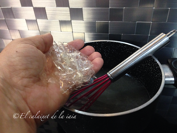 escurrimos bien las dos láminas de gelatina que ya estarán hidratadas, para eliminar el exceso de agua y lo añadimos al cazo, mezclamos hasta que se disuelva