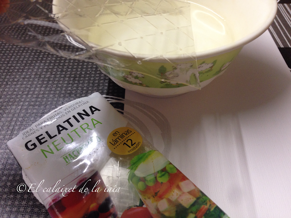pondremos dos hojas de gelatina neutra a hidratar con agua fría unos cinco minutos, o como nos indique el fabricante