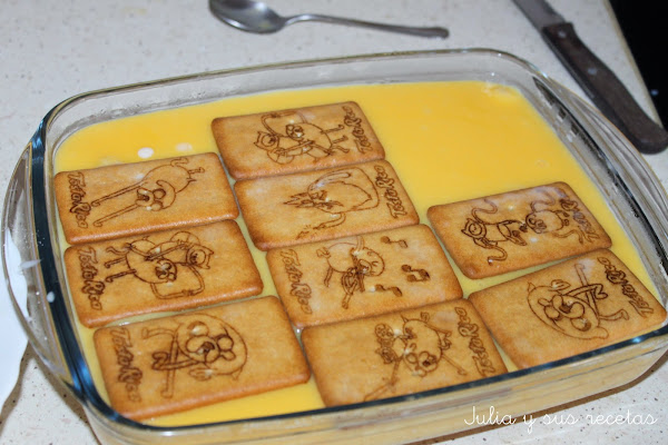 Hacemos el flan como nos dice el fabricante, es decir, diluimos el preparado de flan en un vaso de leche fría y el resto la ponemos a hervir al fuego en un cazo junto con el azúcar, cuando empiece a hervir añadimos el contenido del vaso y removemos hasta que espese un poco. Lo echamos encima de las galletas y ponemos 2-3 capas de galletas encima. Dejamos que se enfríe y metemos en el figorífico.