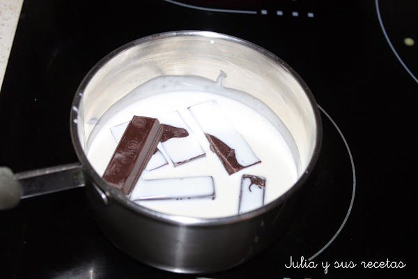 Pasadas 2-3 horas hacemos la cobertura. Ponemos la nata (crema de leche) y el chocolate al fuego lento hasta que se derrita el chocolate, lo sacamos del fuego y añadimos la margarina. Dejamos que se temple.