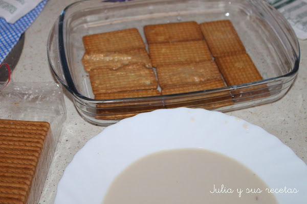 Ponemos una o dos capas de galletas cubriendo el fondo del molde. Podéis humedecerlas un poquito (muy poco con leche).