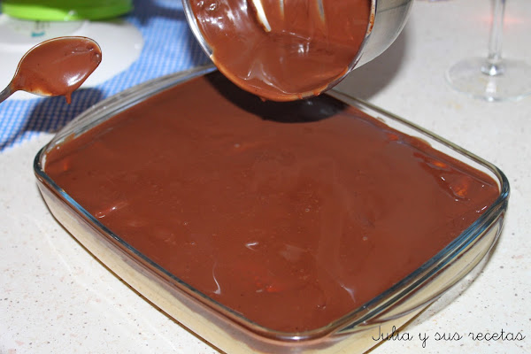 Cuando esté casi frío lo ponemos encima de las galletas y dejamos enfriar. Lo metemos en el frigorífico hasta el día siguiente.