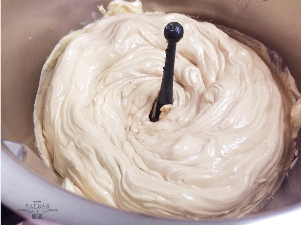 Limpia y seca bien el vaso y pon la mariposa. Pon la mantequilla en el vaso a temperatura ambiente y programa vel. 2 sin tiempo, cuando veas por el bocal que la mantequilla tiene el aspecto de pomada ves incorporando por el mismo el preparado anterior, muy lentamente para que la mantequilla coja la consistencia de la crema de moca. Tiene que quedar montada y homogenea.