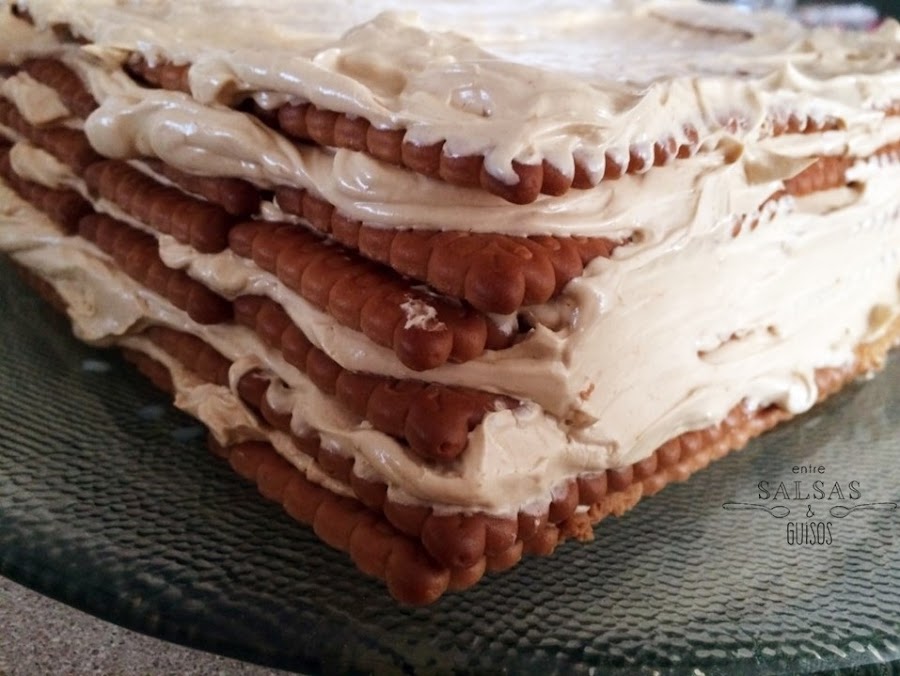 Forra un molde desmontable con film transparente y empieza a montar la tarta. Para ello ves mojando las galletas en la leche y hacemos la prmiera capa de galletas, sobre ella incorporamos una capa de moca y sobre ésta otra de galletas y asi sucesivamente, termina con una capa de moka.