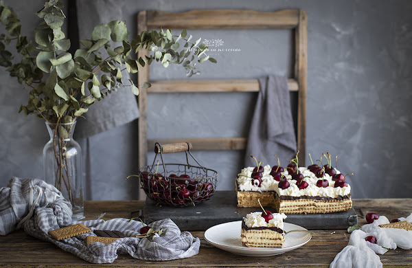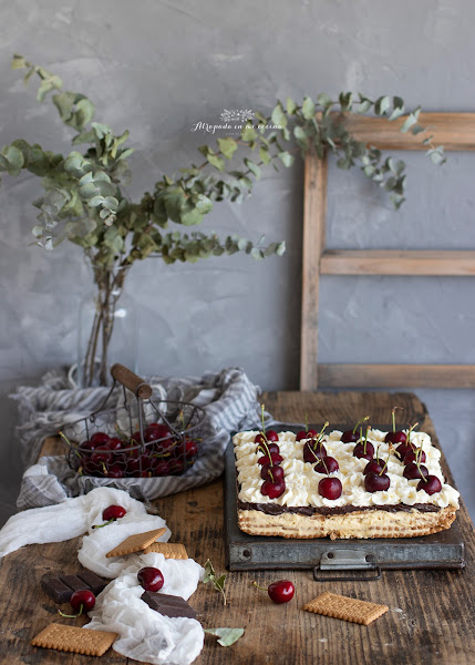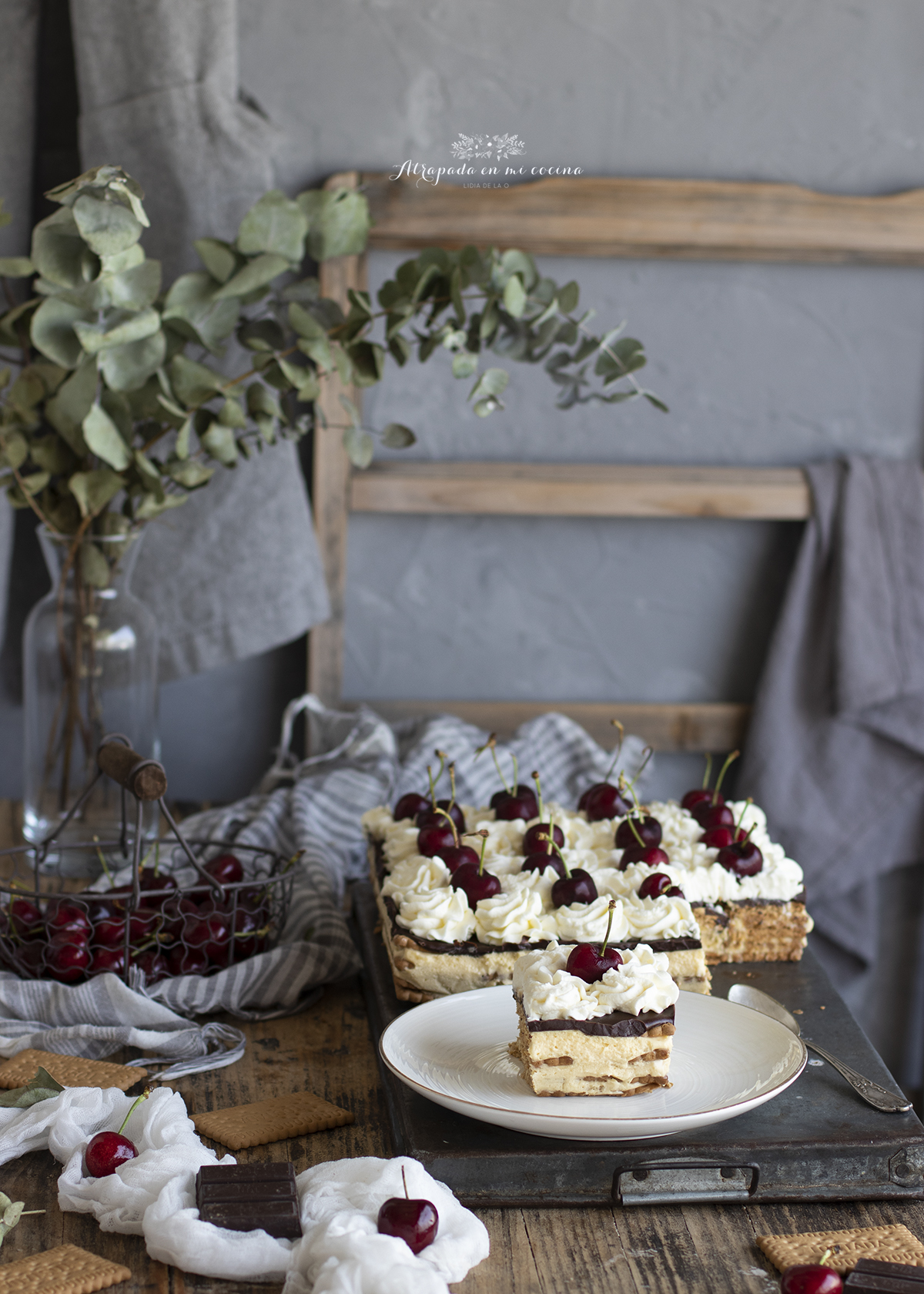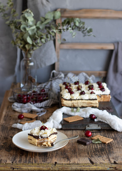Es lunes y vengo con receta y vídeo receta de la misma, como en las últimas semanas. Se trata de la tradicional tarta de la abuela, la de galletas de toda la vida, pero con la diferencia de que en el relleno lleva crema de queso mascarpone. La he decorado con cerezas, aprovechando los productos de temporada. No tiene la presencia de otras tartas más imponentes, pero os aseguro que está riquísima, y os animo a prepararla.