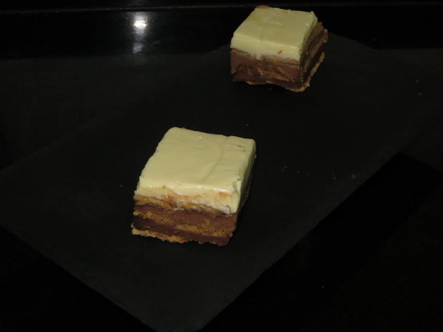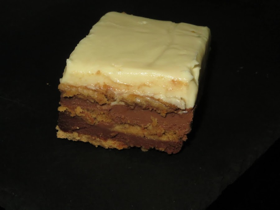Metemos a la nevera para que se enfríe. Colocamos otra capa de galletas mojadas en leche, aunque también se pueden mojar en café y repetimos la operación con la tableta de chocolate con leche. Metemos a la nevera, ponemos otra capa de galletas y ponemos la última capa de chocolate blanco y dejamos en el molde hasta el día siguiente y ya está lista para degustar.