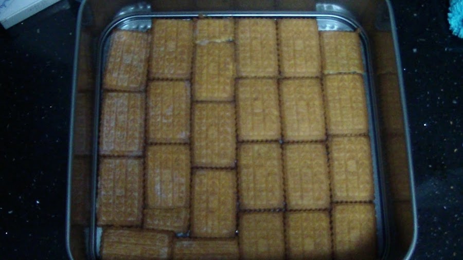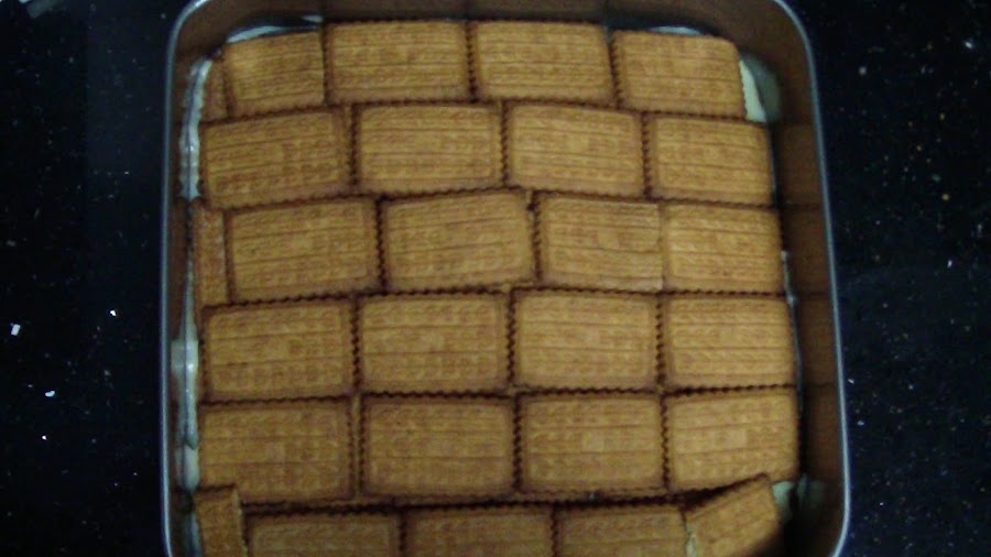 Ahora comenzamos con el resto de nuestra tarta, preparamos el café como más nos guste y vamos remojando las galletas en el café y las vamos poniendo en nuestro molde, en este caso al ser cuadrado, las galletas son cuadradas, una vez que tenemos una capa de galletas, echamos encima nuestra crema pastelera. Alisamos la crema pastelera y remojamos el resto de las galletas hasta hacer dos capas más. Ahora metemos la tarta a la nevera para que se enfríe un poco mientras preparamos el chocolate.