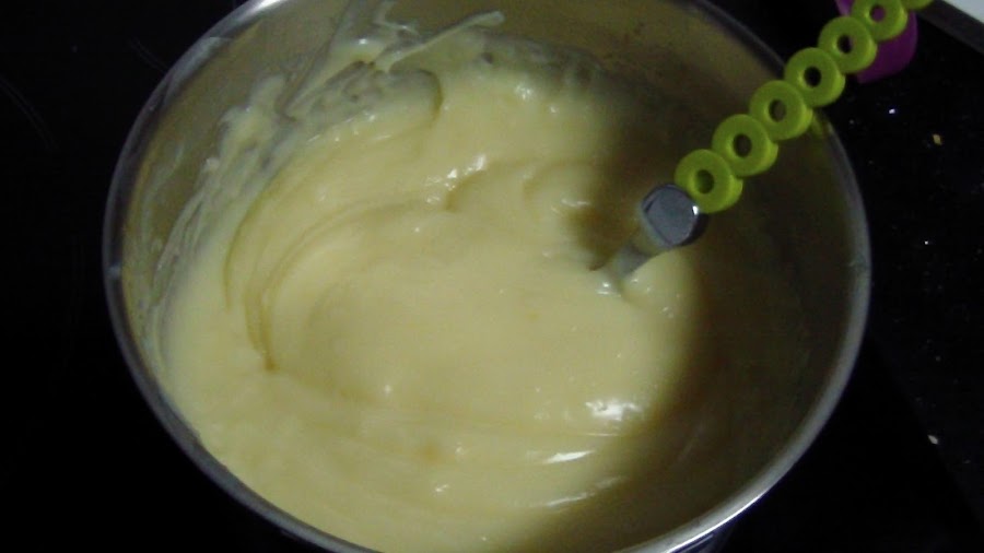 Lo primero que vamos a hacer es la crema pastelera que es lo que más tiempo nos va a llevar. Se coloca en un cazo 800 mililitros de leche, la vainilla y se pone a calentar. Cuando lleve unos minutos al fuego, añadimos las yemas y mientras tanto con lo que nos ha sobrado de leche disolvemos la maicena, tened cuidado de que no se os queden grumos. A continuación, añadimos el azúcar y no dejáis de dar vueltas, ya que si no se os puede agarrar y cuando comience a hervir la leche echamos la maicena y le damos vueltas hasta que espese.