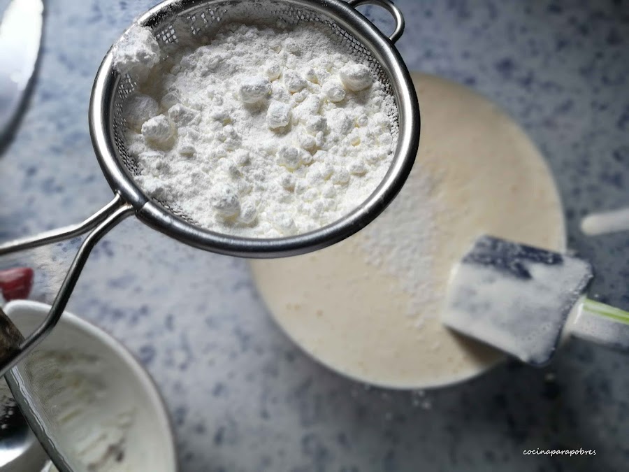 Mezclamos la harina con la maicena y la levadura, tamizamos con movimientos envolventes, la incorporamos en la mezcla anterior con movimientos envolventes.