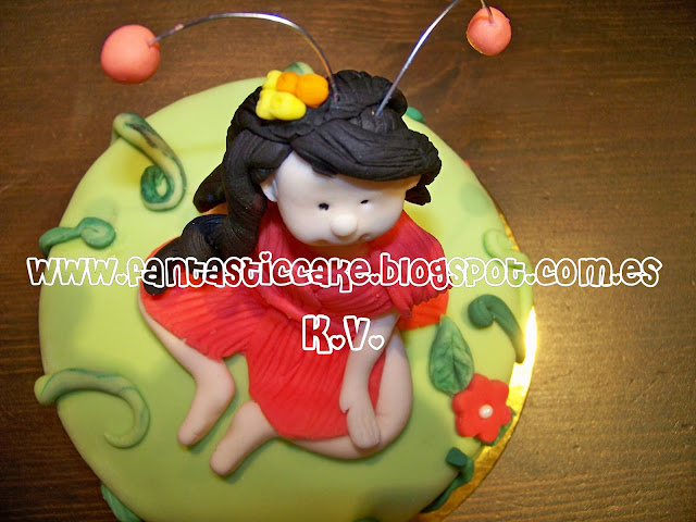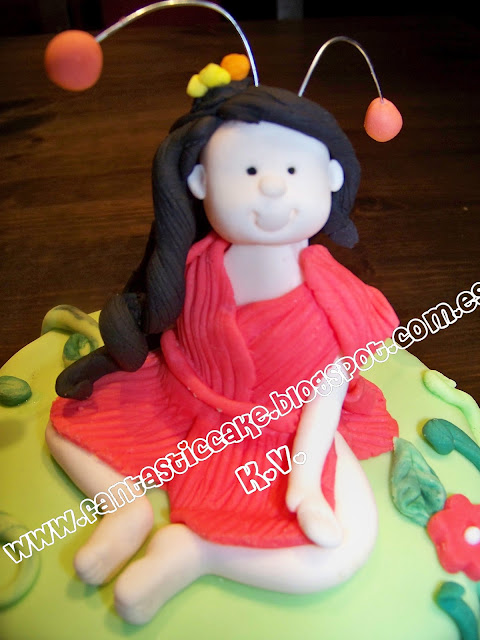 Así que me puse a modelar un poco porque querían un hada en la tarta. Me llevo su tiempo pero lo conseguí, quedo muy guapa... no os parece?? con antenitas y todo incluido.
