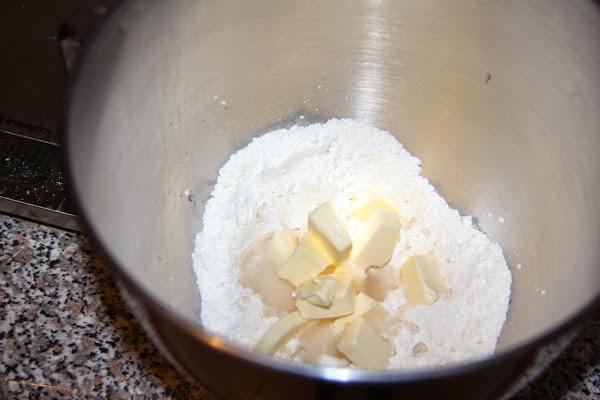 Comenzamos preparando la masa de base; para ello tamizamos en un bol la harina. La mezclamos bien con la almendra molida y la sal. Formamos un volcán y ponemos la mantequilla a dados y el agua fria, amasando bien todos los ingredientes.