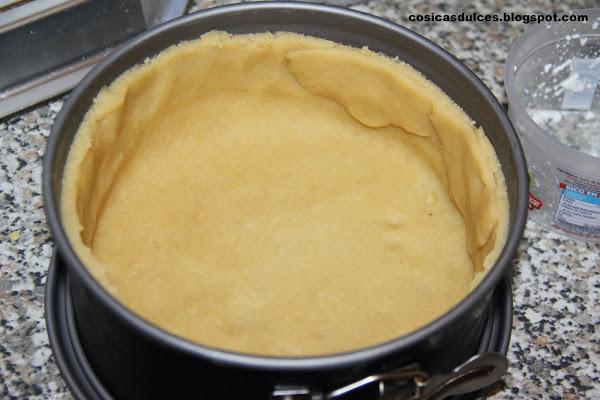 Con la masa forramos un molde de 20 centímetros y lo refrigeramos durante media hora.