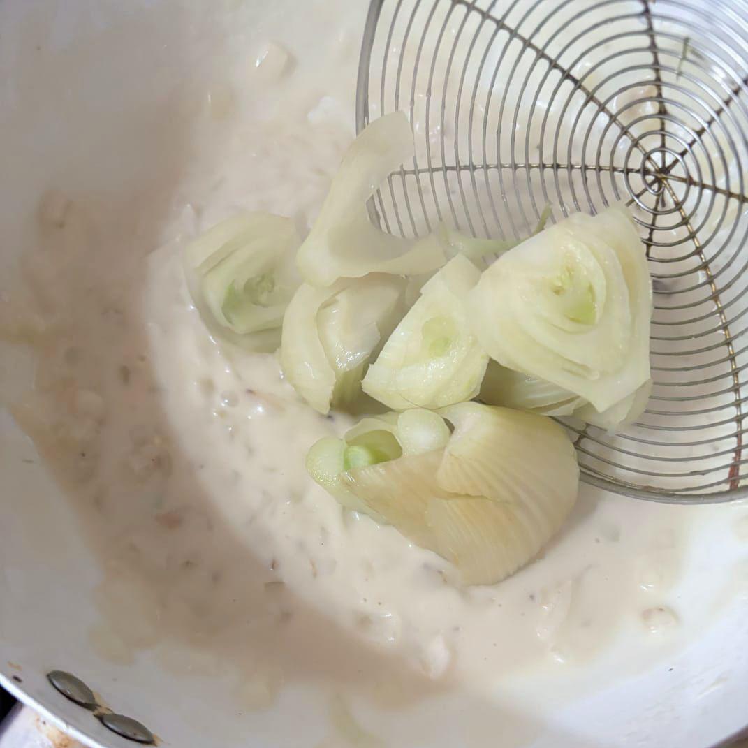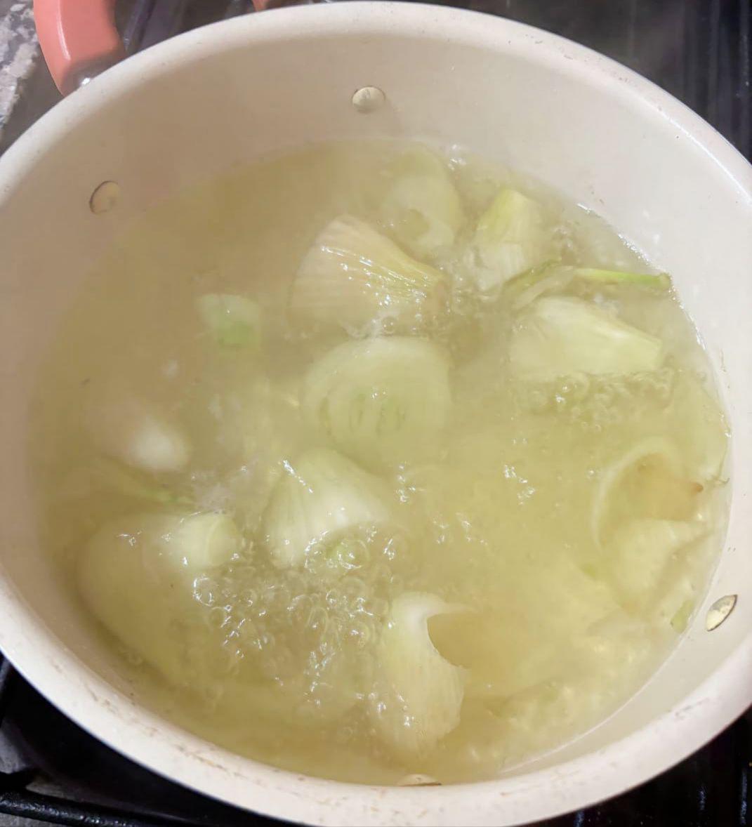 2-Hervir los hinojos con agua y limón cortados ( se usa la parte blanca) hasta que estén tiernos, pasar por agua fría y reservar.