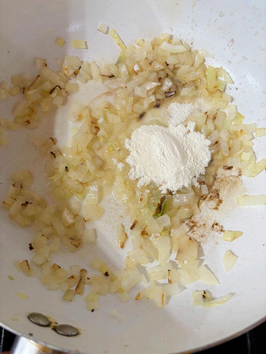 3-Salsa bechamel : rehogar en una sartén con aceite la cebolla picada , el ajo, con sal y pimentón, cuando esté transparente agregar la fécula y leche vegetal , revolver y cocinar unos minutos, hasta que espese.