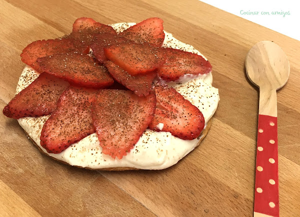 Cortamos las fresas en rodajas y cubrimos la tarta, terminamos espolvoreando un poco de azúcar glass y cacao en polvo.