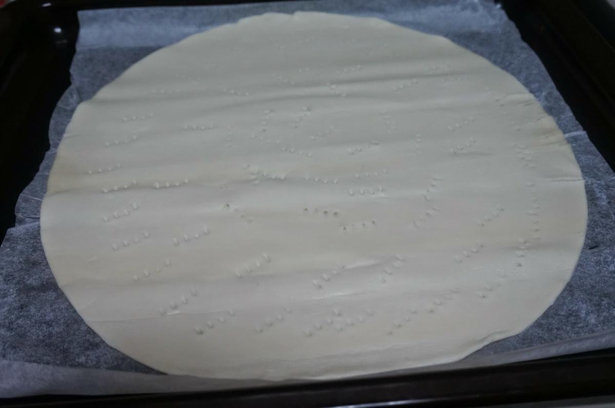 Preparación:Cogemos la masa de hojaldre, puede ser redonda o alargada, la ponemos el la placa del horno. Pincharemos la masa con un tenedor.