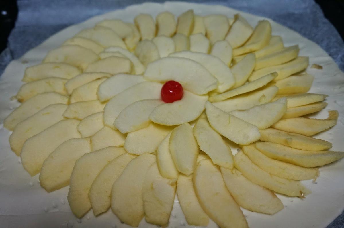 Pondremos los trozos de manzana en forma de flor, sin llegar a los bordes.