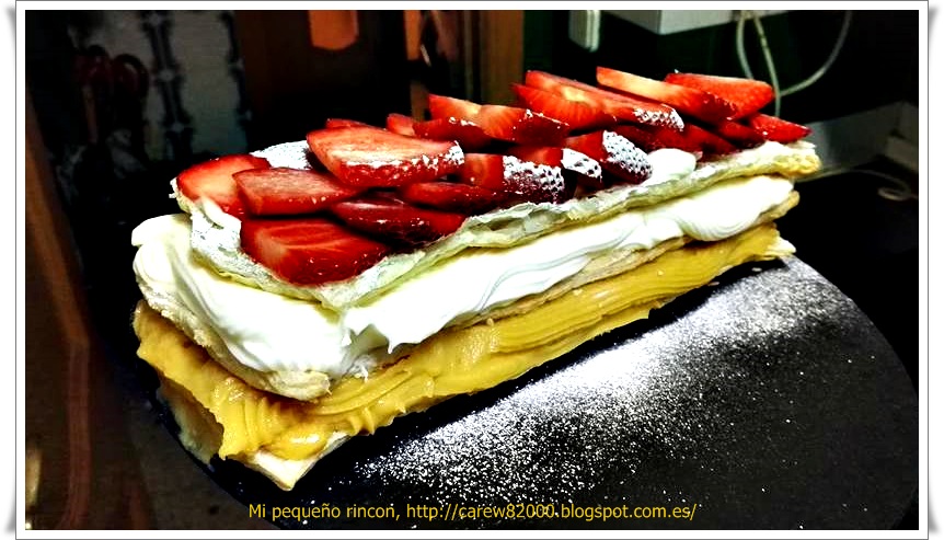Cubrimos la nata (crema de leche) con otro trozo de hojaldre y con ayuda de una lengua extendemos un poco de nata (crema de leche) en la parte de arriba para colocar las fresas y queden fijadas, este paso lo podéis hacer como mas os guste.