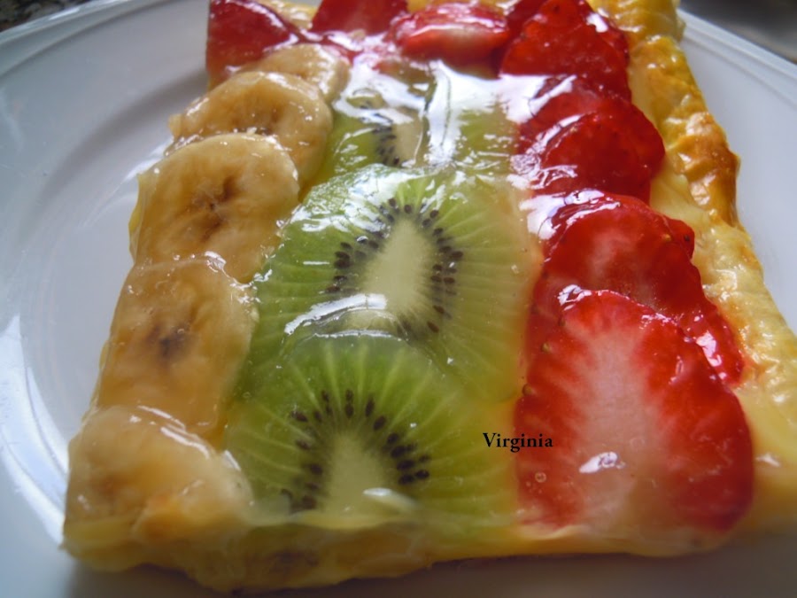 Montaje: Con la plancha de hojaldre fría, la colocas en una fuente que vayas a servir la tarta. Añades la crema pastelera y la extiendes bien con la cuchara.Ahora vas decorando como en la foto o como te guste más con la fruta que has cortado a ruedas. Puedes utilizar otras frutas?Pincelas con el glaseado para dar brillo.