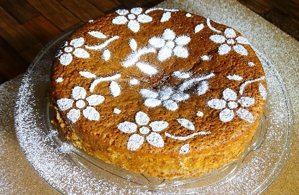 Pasado el tiempo del horno, la retiramos con cuidado y vamos a ir emplatando. Vamos a espolvorear azúcar glas por encima, me he servido de un molde de flores para darle una presentación bonita.Espero que te haya gustado y puedes verla también paso a paso en el video. Vas a disfrutar de una receta bizcocho esponjoso. Déjala que se enfríe para saborearla mejor, de ese modo consigues una deliciosa tarta fría para las tardes de verano.