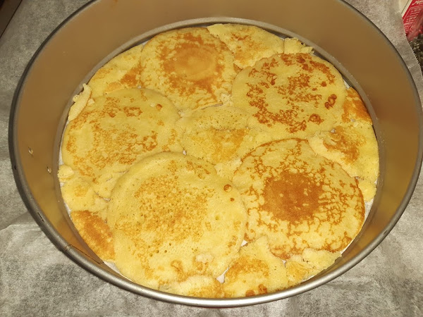 En un molde desmontable ponemos en la base papel de horno y cubrimos todo el papel con las tortitas. Como en la foto.