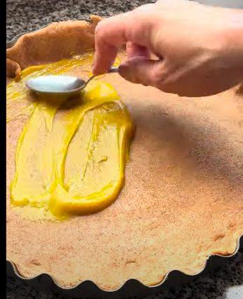 6-Estiramos la parte de la tapa y cubrimos la tarta, hacemos un repulgue y pincelamos con la yema batida.