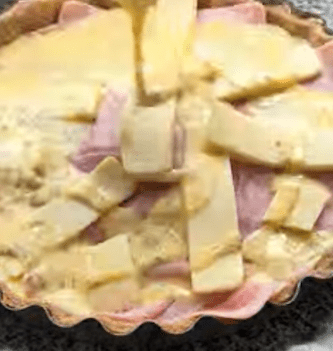 5-Pincelar con mostaza, y acomodar una capa de fetas de jamón, encima trozos de mozzarella y un poco del huevo batido, hacemos otra capa de jamon y queso y huevo hasta terminar con jamón.