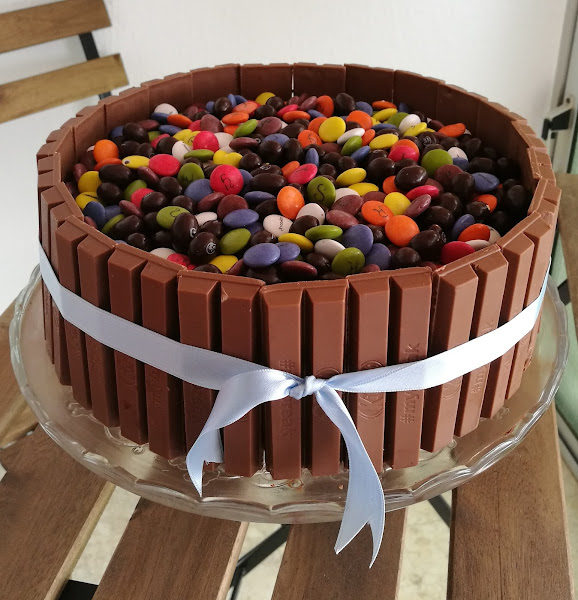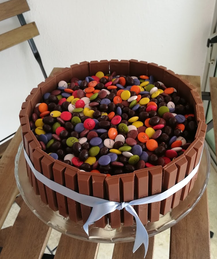 Con la ayuda de una brocha pinte toda la tarta alrededor para poder pegar los Kit Kat.Luego con cuidado coloqué un lacito para decorar y para que los Kit Kat no se movieran. Por último puse por encima los lacasitos y los conguitos.