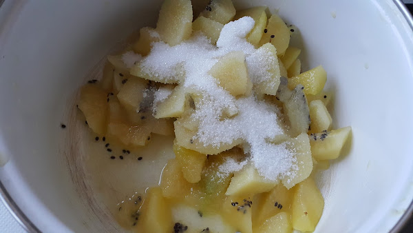 En un cazo ponemos 3 kiwis troceados con el azúcar a fuego muy bajo y vamos removiendo hasta que se deshagan. Si queremos acelerar el proceso, se pueden triturar con una batidora. Ponemos a hidratar la gelatina con agua bien fría.