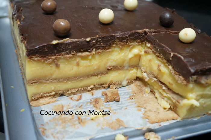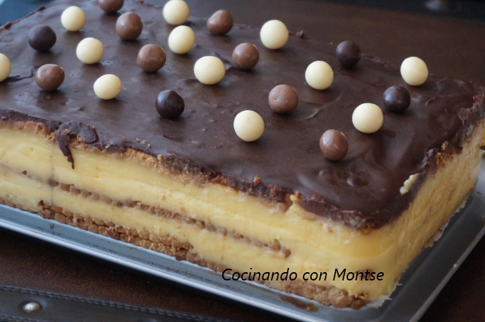 Es una tarta sencilla que no necesita horno solo tenemos que preparar el flan o unas natillas y el chocolate y ya solo queda montar la tarta. Una tarta de galletas con unos ingredientes muy sencillos.