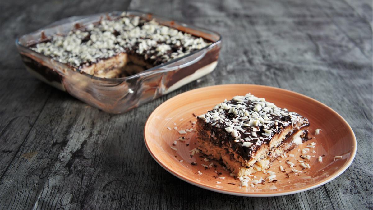 En el molde ponemos una primera capa de galletas. Las mojamos un segundo en leche sin que se empapen ni se rompan antes de ponerlas en el molde. Vertemos una capa de natillas. A continuación, otra capa de galletas, y encima una capa de chocolate. Así, vamos alternando capas hasta acabar la tarta terminando con una capa de chocolate.