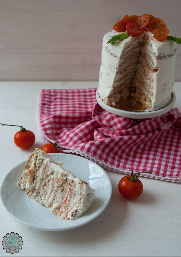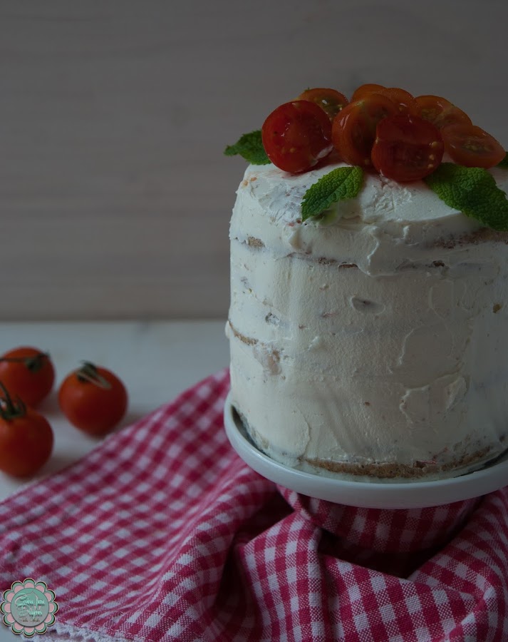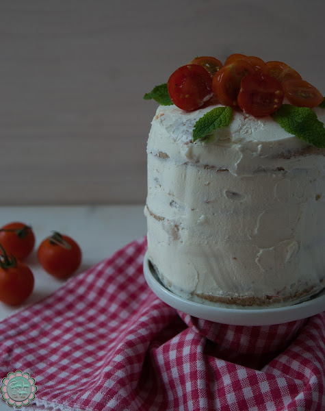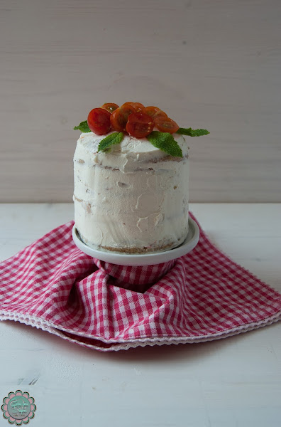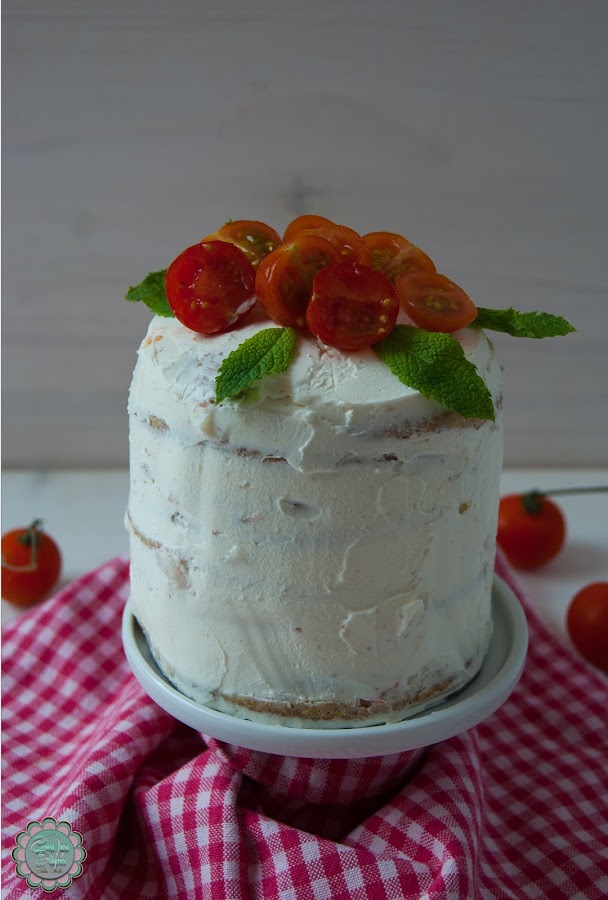 4) Recubrimos todo el exterior de la tarta con queso en crema. Podemos darle un acabado lisito, aunque a mí me pierden los acabados rústicos. Coronamos con unos tomates cherry y unas hojas de menta.