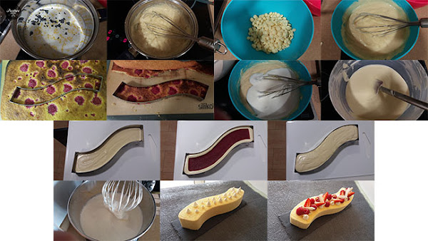 Empezamos con el gelificado, ponemos a calentar los purés de fresa y frambuesa en un cazo, en un bol aparte mezclamos el azúcar con la pectina, y lo vamos añadiendo poco a poco al puré sin dejar de remover para que no se formen grumos, cuando empiece a hervir añadimos el agua de rosas y lo retiramos del fuego y muy rápidamente (aquí hay que ser rápidos porque en cuanto empieza a hervir comienza a espesar muy rápidamente) vertemos sobre el molde. Congelamos.