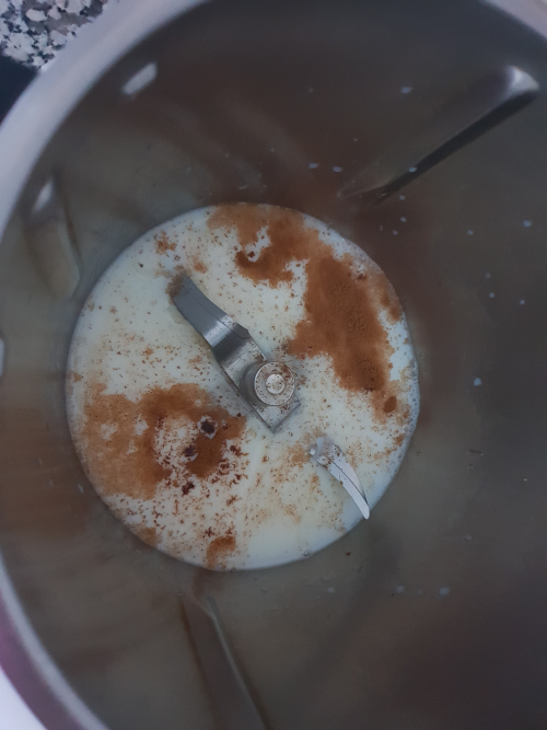 4- Mientras, calentar la leche con la ralladura, canela y azúcar 6 minutos 90ºC velocidad 1. Dejar templar unos 10-15 minutos. Añadir los huevos 4 segundos velocidad 4.