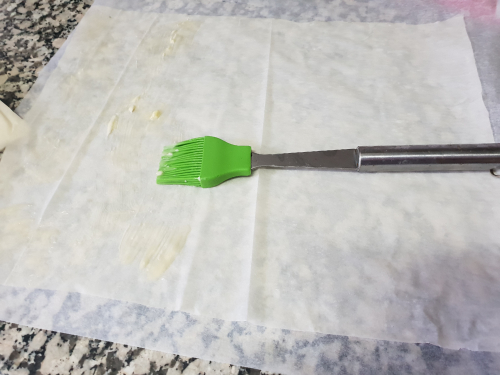 (Si es desmontable poner antes en el fondo papel de hornear). Pincelar cada lámina de masa filo con mantequilla, solo por un lado e ir doblando como si fuera un acordeón o abanico.