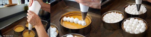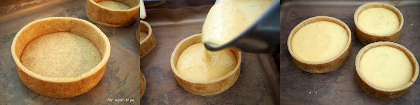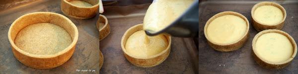 Rellenar las bases cocidas con la crema e introducir en el horno. Cocer a 170º durante 8-10 minutos aproximadamente, la crema ha de quedar cuajada. En el proceso de horneado opcionalmente podemos volver a colocar los aros en las tartas, es una medida de seguridad por si hay alguna unión mal sellada.