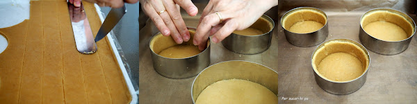 Marcar la forma de la base de los moldes que vayamos a utilizar sobre la masa. Con cuidado cortarla y ponerla en el interior de los mismos.