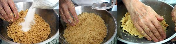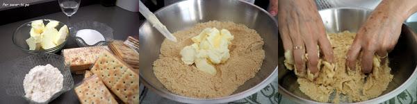 Colocarlos en un bol y añadir la mantequilla en pomada (blandita), y con las manos ir amasando hasta que tenga una textura arenosa.