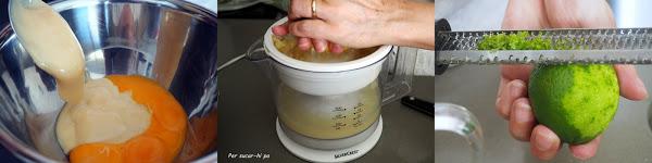 Colocar las yemas y la leche condensada en un bol y batir ligeramente. Añadir el zumo de limón y la ralladura de lima e integrar bien en la crema. Reservar.