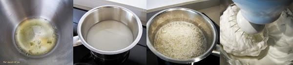 Sin parar la batidora, y a velocidad media ir incorporando el almíbar con un hilo fino, dejándolo resbalar por la pared interior del bol. Seguir batiendo, ahora a velocidad fuerte, hasta que tengamos todo el almíbar incorporado y la mezcla se enfríe.