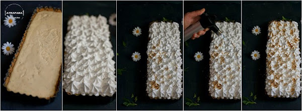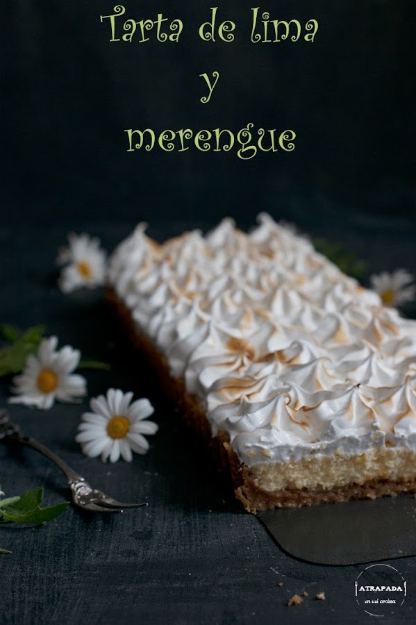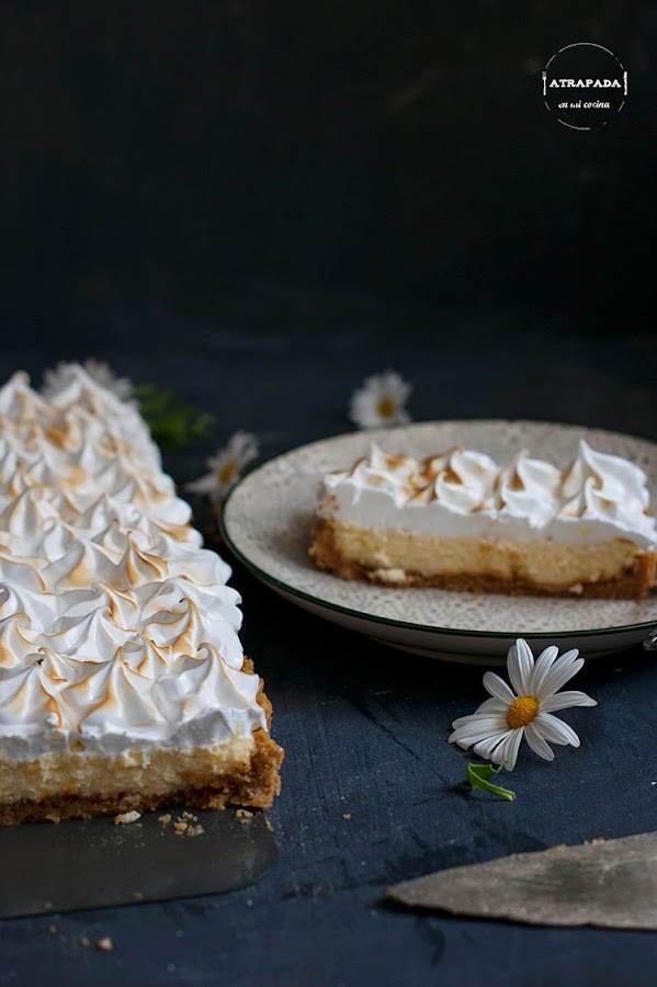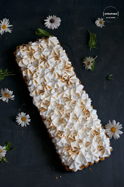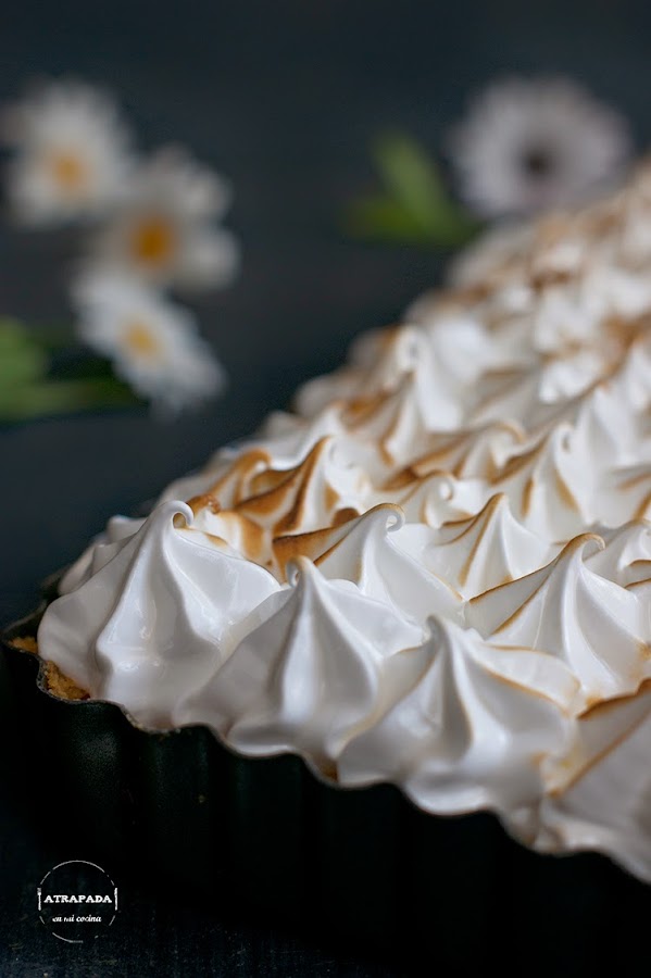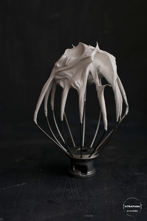 Después preparamos el merengue. Para mi ésta una forma muy curiosa de prepararlo y el resultado estupendo, sin necesidad de termómetro y mucho más rápido que otras formas de prepararlo. Calentamos al baño María las claras y el azúcar hasta que se disuelva por completo éste. Después vertemos la mezcla en un bol y montamos con unas varillas hasta que haga picos suaves. Metemos en una manga pastelera y decoramos la tarta. Quemamos con el soplete para dorar un poco el merengue.