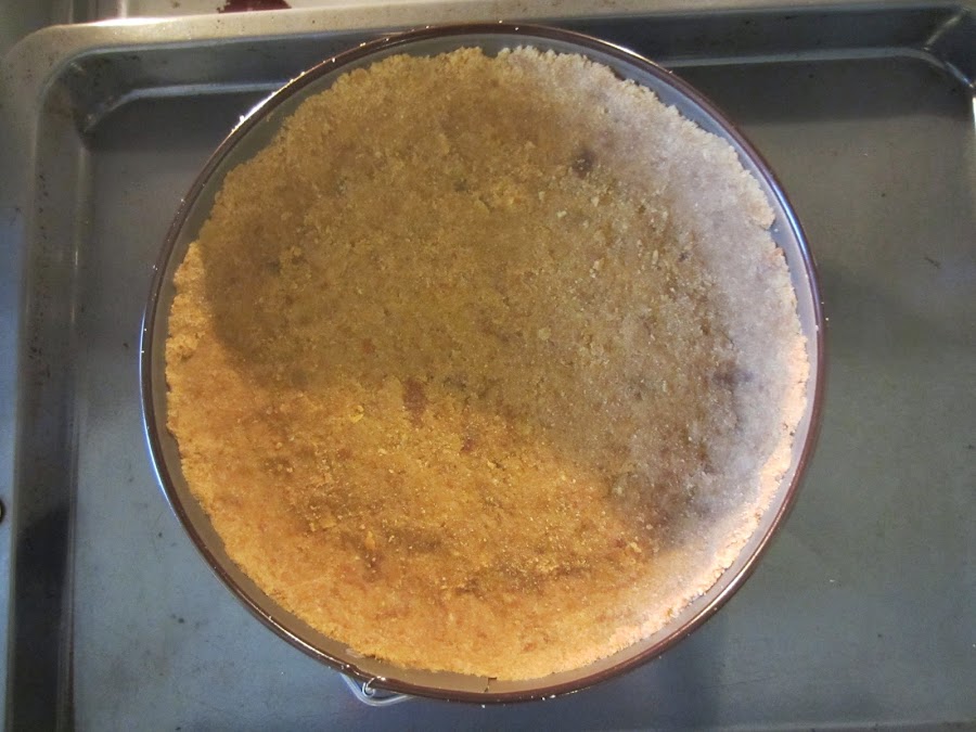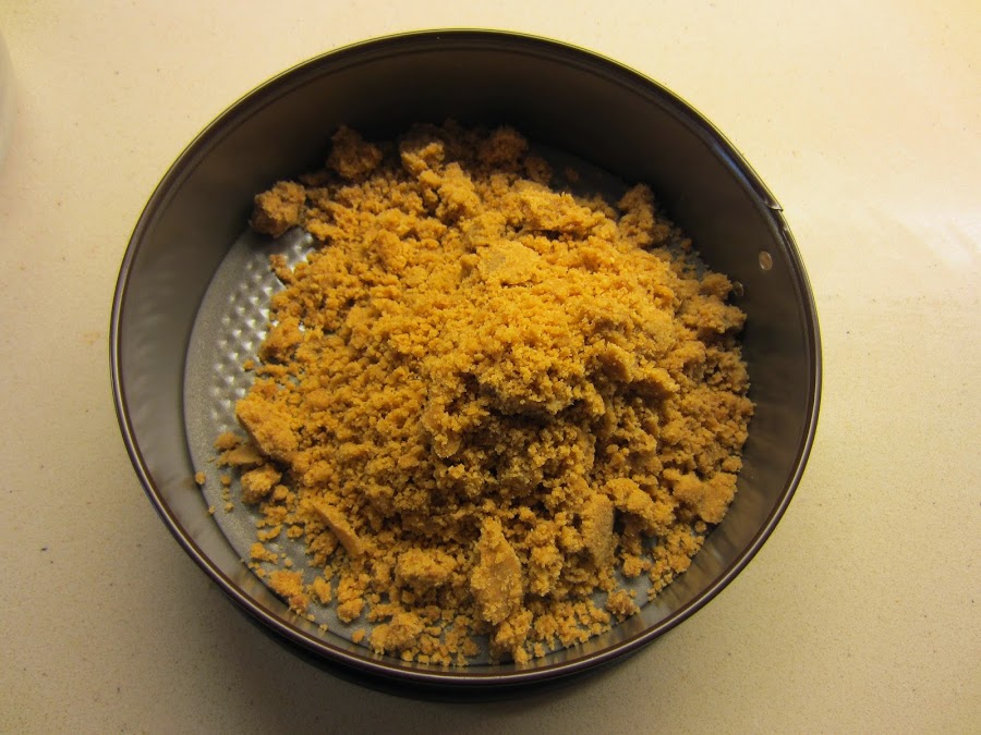 Derrita la mantequilla en un cazo a fuego muy lento o en microondas. Ponga las galletas en una bolsa y tritúrelas. Mezcle estas migas con la mantequilla fundida. Pase esta masa a el molde y aplaste con una cuchara hasta formar una base de tarta. Hornee durante 5 minutos y deje enfriar.