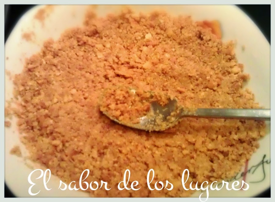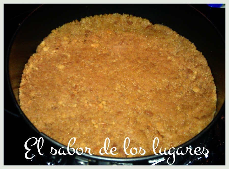 Derrite la mantequilla en el microondas (20-30 segundos a baja temperatura). Tritura las galletas en la picadora o dentro de una bolsa y presionando con el rodillo. Mezcla las galletas trituradas con la mantequilla y 2 cucharadas de azúcar hasta formar una masa, vierte la mezcla en el molde y presiona con una cuchara o los dedos hasta cubrir el fondo totalmente. Reserva en el frigorífico.